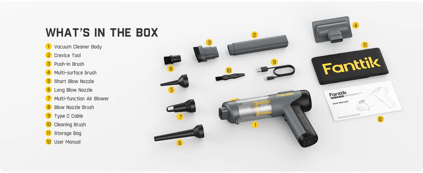 Compact in size and weighs only 0.95 lb, Slim V9 Mix vacuum for car redefines car vac. Its unique ergonomic handle design ensures a comfortable grip, allowing for fatigue-free extended use. With a storage bag that neatly holds all attachments, it is portable for outdoor camping, traveling, business trips, moving to a new home, and any other scenario for on-the-go lifestyles