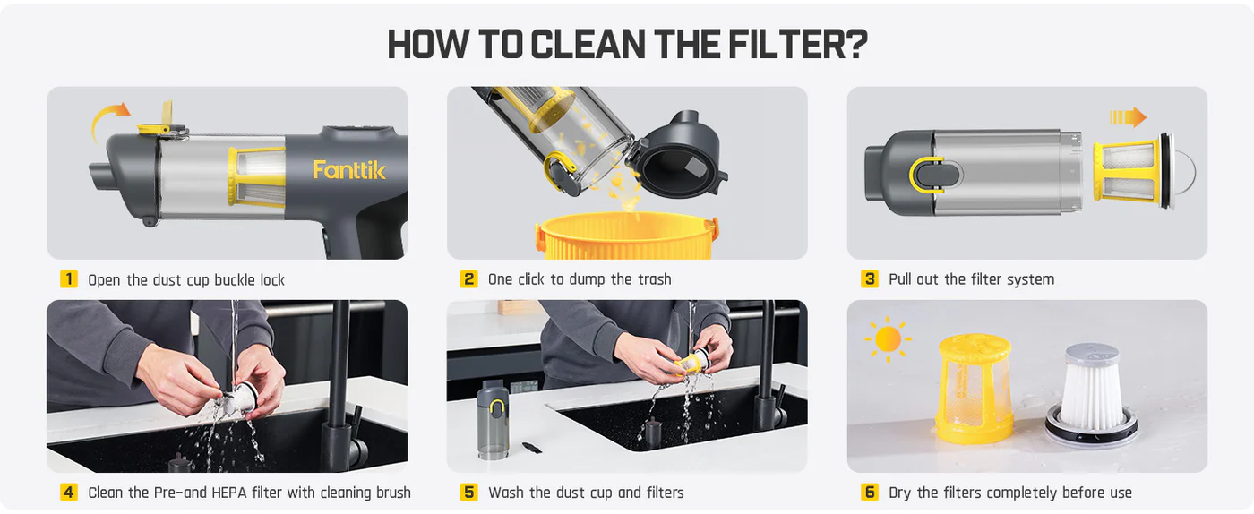 Simply unlock the latch that prevents accidental spills, press the button and pour, without dirtying your hands. The transparent design provides a clear view of the dust collection process, prompting timely disposal. With a double-layer filter system, this handheld air duster is capable of filtering 95.99% of dust and small particles, and Pre & HEPA filter can be easily disassembled and washed, ensuring longer service life.